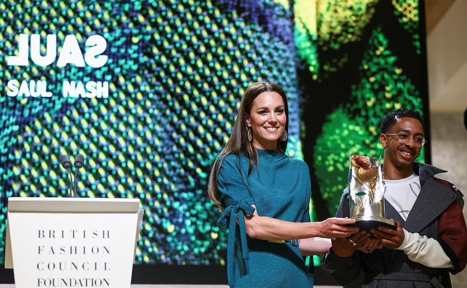 L’événement se tient en présence du sérail de la mode. Raison de plus pour lisser son allure. La duchesse de Cambridge, qui succède à la comtesse de Wessex dans ce rôle (Elizabeth II avait récompensé le couturier Richard Quinn puis ce fut au tour de la duchesse de Cornouailles et de la princesse Anne, de décerner les prix ) affiche un look plus pointu, plus trendy– une robe dessinée par une styliste anglo-canadienne diplômée de la prestigieuse St Martins School-un maquillage plus soutenu et un brushing baguette.