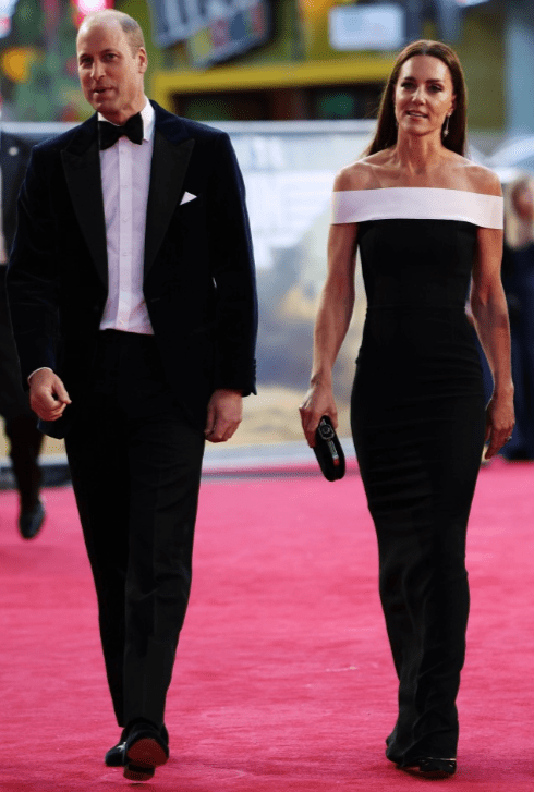 La limousine princière fait son entrée. La robe fourreau bicolore au décolleté bateau du couturier français Roland Mouret, épouse et sculpte le corps musclé de l’athlétique duchesse. Des boucles d’oreilles précieuses égayent sa coiffure lisse à la Rooney Mara. Le prince William en smoking symbolise cette classe so british. Ses souliers de velours sont ornés d’avions rebrodés. Le couple star de la Couronne a fière allure en noir et blanc.