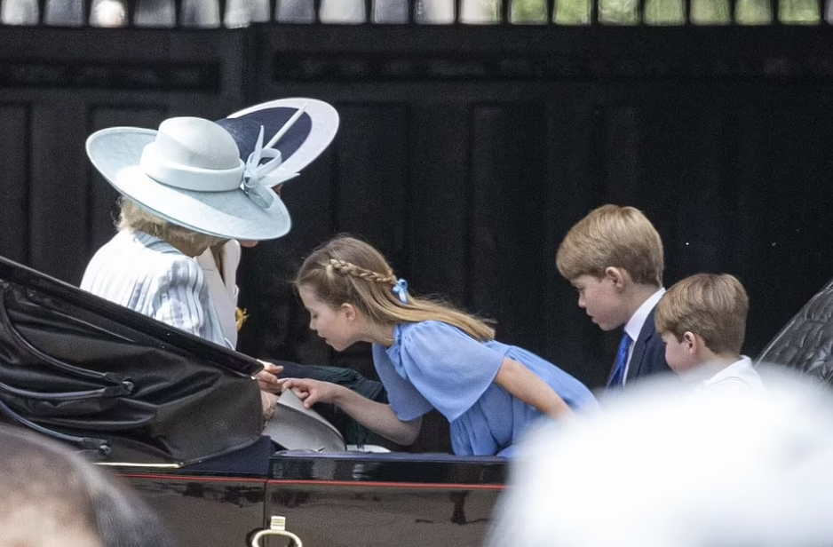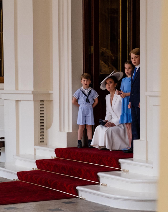 Généreux, le duc et la duchesse de Cambridge nous offrent deux photos des coulisses de la cérémonie du Salut aux Couleurs. Ici, Kate et les enfants attendent leur landau