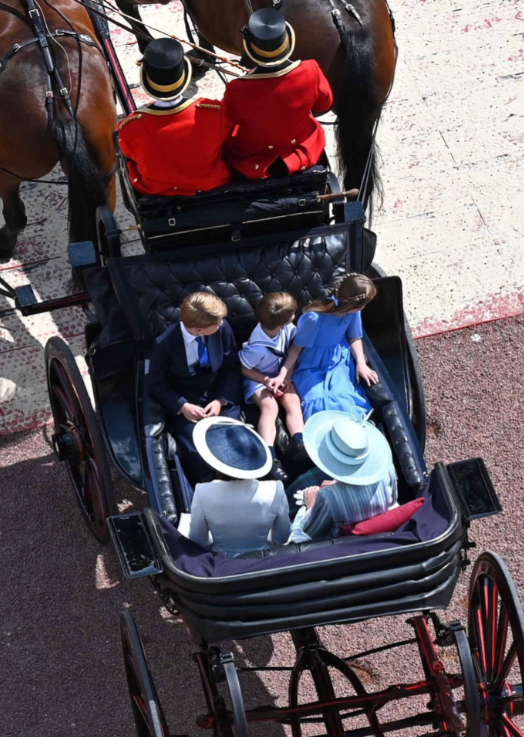 Trooping The Colour 2022, George, Charlotte et Louis de bleu vêtus rendent hommage à leur arrière-grand-mère. Les enfants Cambridge s’offrent leur premier tour de landau