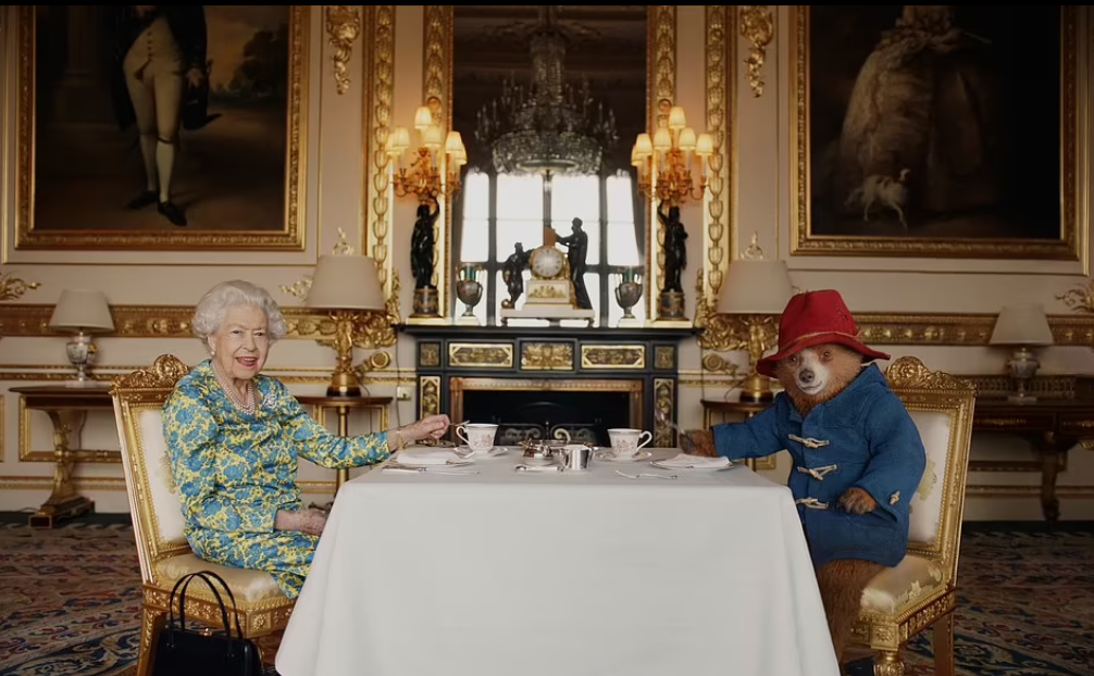 La reine a invité son ami Paddington. Chacun a son sandwich à la confiture