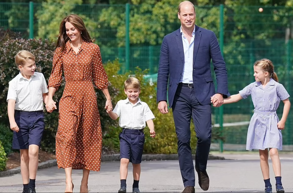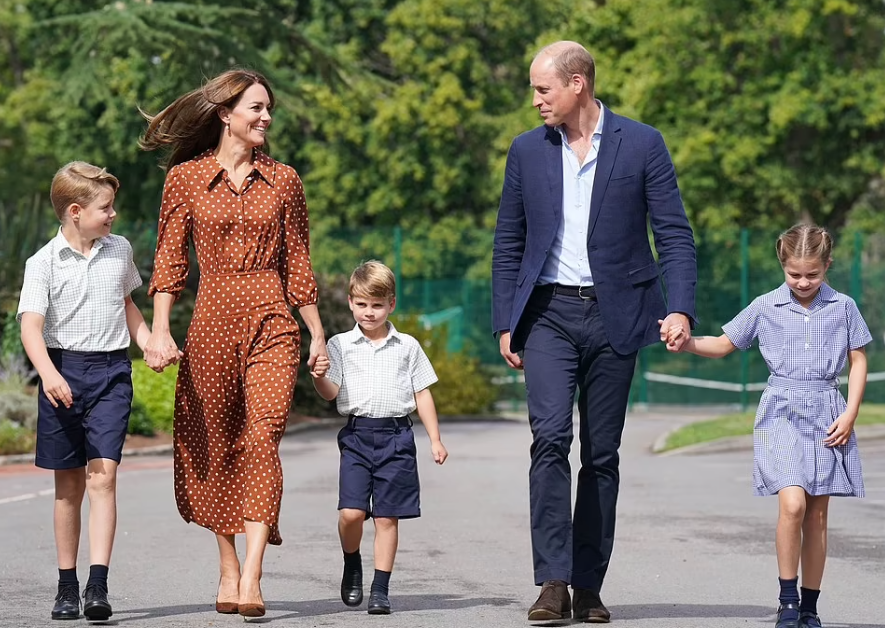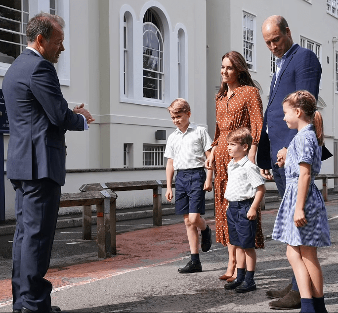 George, Charlotte et Louis reprennent le chemin de l’école sous le feu des projecteurs. Ils visitent la Lambrook school accompagnés de leurs parents. La duchesse a choisi une robe à pois pour le grand jour.