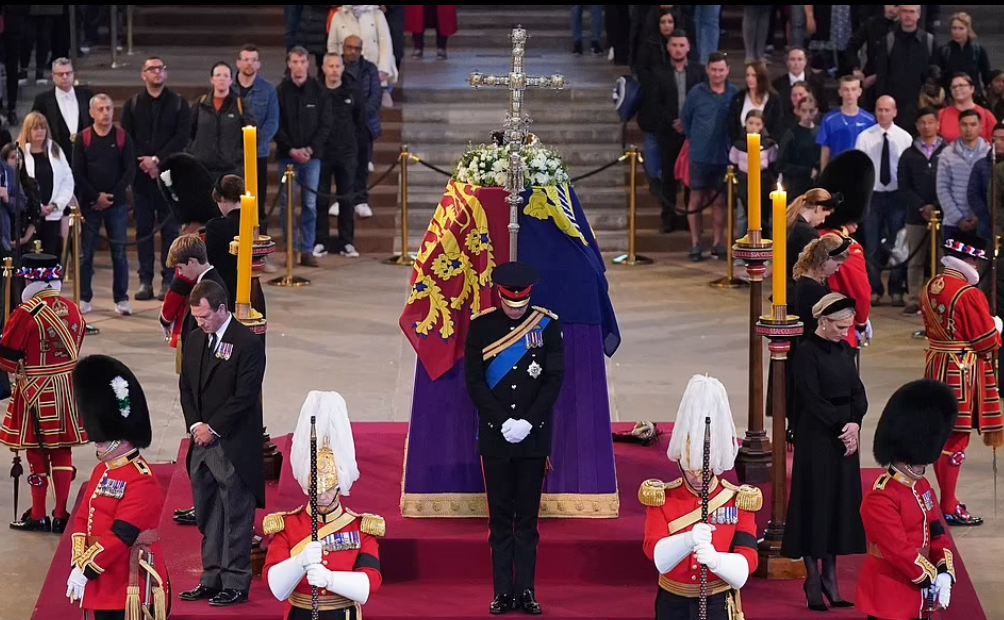 A Westminster Hall, Charles III et les siens assistent à une cérémonie sobre, mêlant larmes et révérences. Après s’être recueille, la famille royale s’éclipse, laissant la souveraine à son peuple. Munis d’un bracelet sésame, les pèlerins sont des milliers à venir s’incliner devant le catafalque, trônant dans le hall du Parlement. Il faut faire preuve de patience : compter 14 heures pour espérer se recueillir brièvement. Le peuple d’Angleterre donne une leçon de civisme au monde. Tout se déroule dans le calme et le respect. Il n’y a quasiment pas de service d’ordre. Vendredi 16 septembre, un forcené profite de l’occasion pour poignarder deux policiers. On interdit aussitôt l’accès au cercueil d’Elizabeth II. L’instant le plus émouvant fut la veillée des huit petits-enfants. Conduite par le prince William, la famille entoure la dépouille et se recueille dans un silence de cathédrale pendant 17 minutes. Accompagné de son successeur, le roi va au contact de ses sujets massés aux abords du Parlement. Il cultive la proximité. En regardant la peluche Paddington que lui présente une femme, Charles mentionne que c’était “l’ours préféré de sa mère“. Toujours très prévenant envers son peuple, le nouveau prince de Galles pose des questions, demande à un petit garçon qui a l’âge de son fils George si il n’a pas trop froid. La communication de ce nouveau règne change. La distance observée par la souveraine appartient au passé.