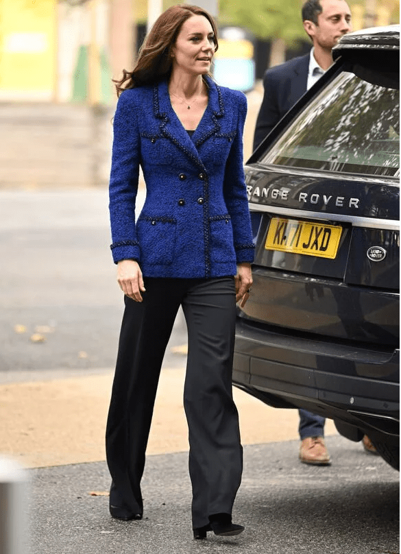 Le couple princier se rend à l’Olympic Park Queen Elizabeth pour y célébrer l’anniversaire d’une œuvre. La princesse de Galles remet le bleu à l’honneur. Cocorico ! Elle étrenne une veste Chanel, le nec plus ultra.