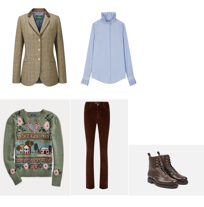 J’ai fait évoluer le style de Kate ( film familial tourné dans le Norfolk) vers une version plus luxueuse. Veste en Harris Tweed, chemisier col victorien, pull enfantin, slim châtaigne et bottines plates, inspirez-vous.