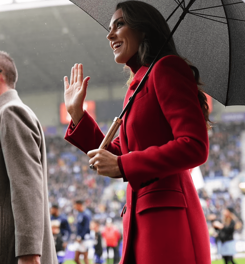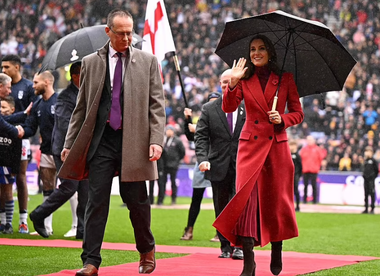 La météo n’est pas au rendez-vous. Abritée sous son parapluie, la marraine croise les doigts en passant les dieux du stade en revue. Du haut de la tribune du stade DW de Wigan réservée aux Windsor, bien pelotonnée dans son manteau rouge Alexander McQueen, princesse Catherine surplombe l’évènement.