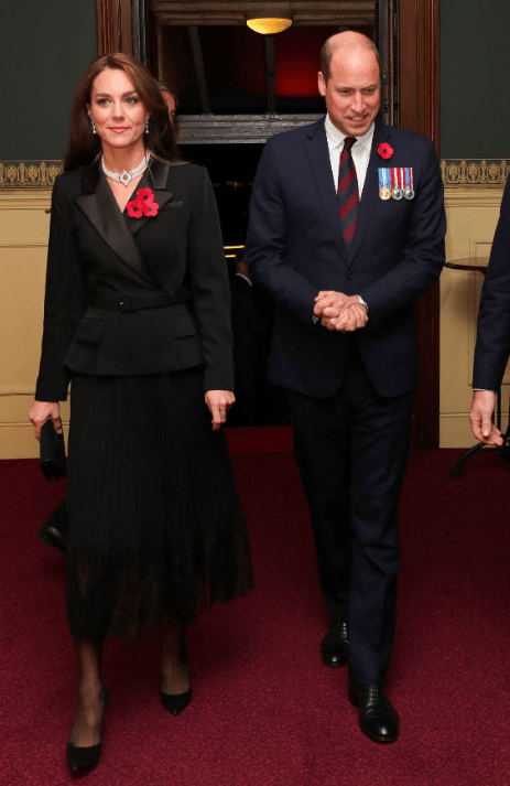 Jadis placé sous le patronage de la reine Elizabeth II, La Légion Britannique est désormais entre les mains de son successeur, Charles III, roi d’Angleterre et chef des armées. Les limousines convoient les royaux au Royal Albert Hall. Les flashs crépitent à l’arrivée du prince et de la princesse de Galles, stars incontestées de la cour. Le vestiaire est voué au noir. Catherine arbore une veste smoking posée sur une jupe en dentelle. Trois coquelicots fleurissent son revers de satin. En souvenir de la reine, la princesse de Galles a remis la parure de perles.