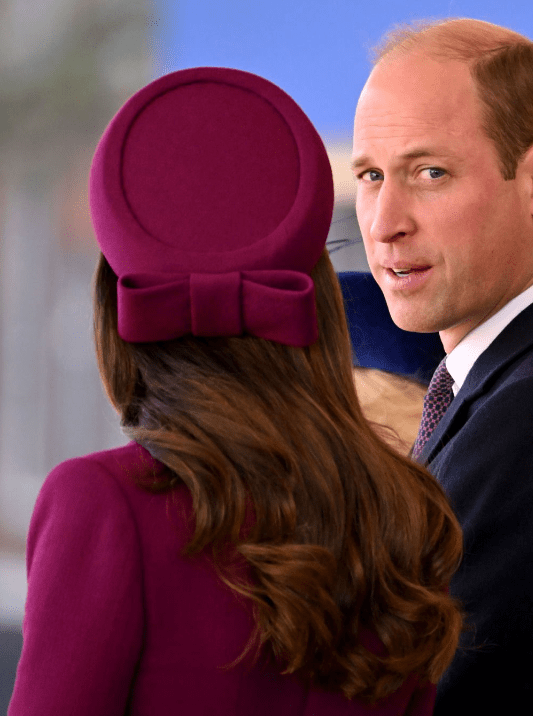 Le futur roi et sa très charismatique épouse reçoivent le président au nom de Sa Majesté le roi Charles III. Le soft power entre en scène. Les présentations sont faites à l’hôtel Corinthia, sous une nuée de flashs. L’instant est protocolaire, l’accueil convivial, la tenue de la princesse de Galles très formelle. Coupée au scalpel, sa robe manteau violine se fond dans l’évènement. Kate étrenne une broche haute joaillerie sur le revers: le bijou représente les plumes d’autruche, emblématiques du prince de Galles. Il fut offert en cadeau de mariage à Lady Diana. La défunte princesse avait l’habitude de le porter en pendentif. Un chapeau pillbox popularisé par Mrs Kennedy ( le couturier Halston créa le légendaire couvre-chef) le rehausse.