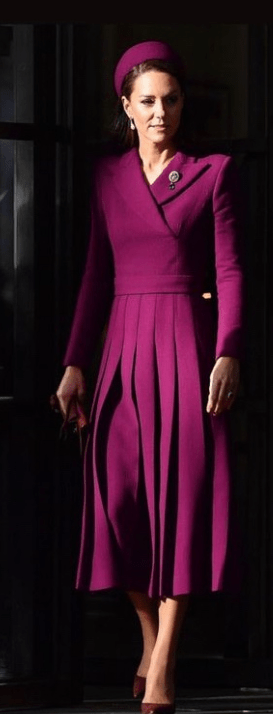 Kate ne prend pas beaucoup de risque avec cette robe manteau qui est sa coupe fétiche. Néanmoins, ce violet, plutôt dans les tons chauds, lui va très bien et reste original.