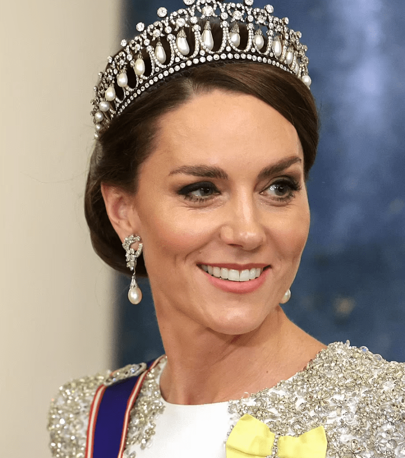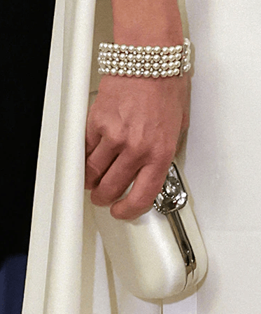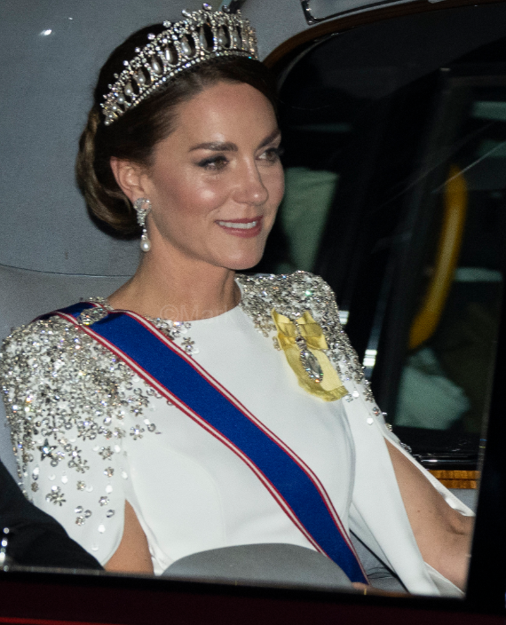 Ses admiratrices se languissaient. Trois ans que Catherine The Great n’avait pas ourlé son front d’une tiare scintillante. Halo, Fleur de lotus, Nœud des amoureux Cambridge, trois diadèmes sont en lice. L’étoile des Windsor a jeté son dévolu sur la Lover’s Knot Cambridge, le joyau le plus porté par sa belle-mère Lady Diana. La robe cape à sequins de sa couturière attitrée fait écho à celles de la défunte reine qui s’habillait toujours de blanc à ce genre d’évènement. Une tonalité symbolique, associée à la paix, célébrant le lien entre les nations.