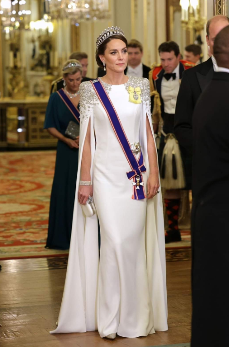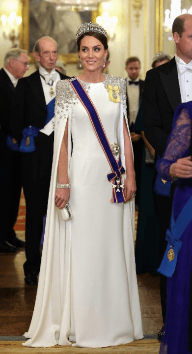 Un sans faute pour cette première visite d’état sous Charles III. La robe est splendide et la princesse de Galles a l’aura d’une Reine Consort. Mais je la trouve maigri depuis la disparition de la Reine Élizabeth II. Probablement le contre-coup du deuil et la pression dû à son nouveau statut.