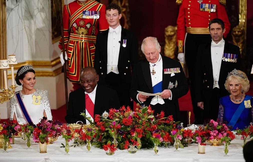 Le foie gras ne sera pas servi. Le monarque, fervent défenseur de la cause animale a banni la spécialité des tables royales. Au menu ce soir : filet de barbue sauce champignons et truffes, ballotine de faisan Windsor aux artichauts et sa compote aux coings, panaché de carottes, chou frisé rôti et pommes de terres fondantes. Le dessert se compose d’un parfait vanille aux pommes caramélisées. De grands crus accompagnent les mets délicats. La Protéa, fleur symbolique d’Afrique du Sud, a inspiré les chefs pâtissiers. Leurs créations en sucre seront proposées avec le café et les petits fours, à la fin du festin.