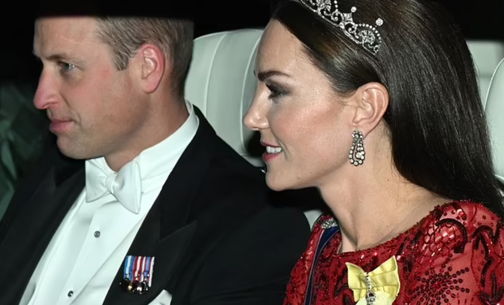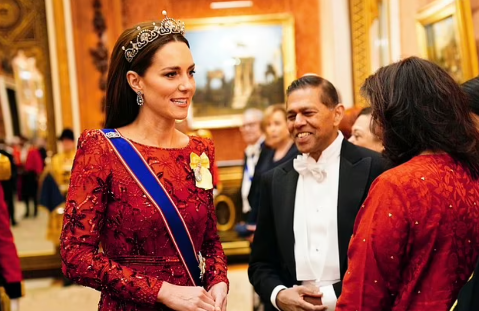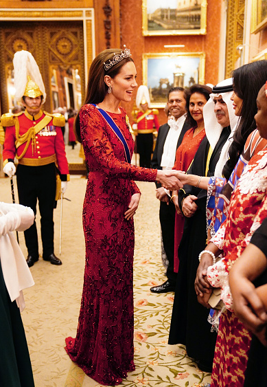 Le roi Charles III reçoit les délégations au palais de Buckingham. La royauté met en avant ses protagonistes. Les Galles, fraichement revenus de Boston où ils ont fait un tabac, secondent le couple souverain. Les caméras nous offrent plusieurs vues du salon d’apparat où se déroule la réception annuelle. Elles filment l’arrivée de la limousine à bord de laquelle ont pris place Kate et William. Les fans ont le temps d’apercevoir le diadème fleur de lotus de la princesse et la nuance de sa robe rebrodée de perles et de sequins.