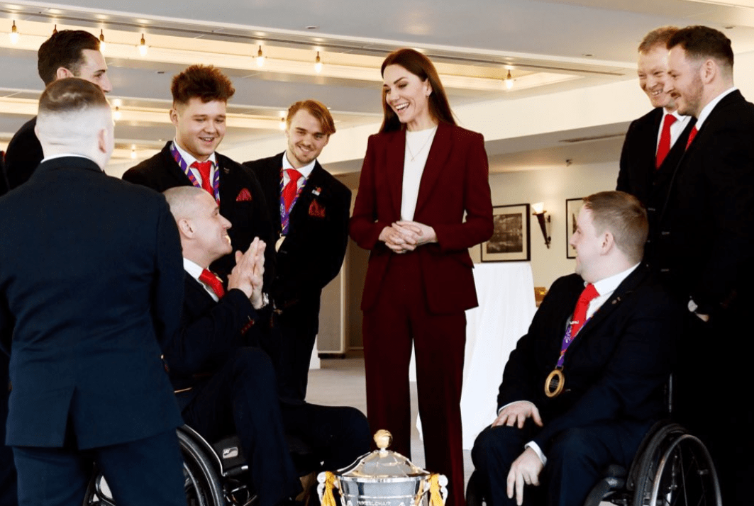 La princesse refait une apparition très médiatisée en cette fin de semaine. Elle reçoit l’équipe de rugby catégorie fauteuil roulant. Les dieux du stade ont battu la France en novembre, en coupe du monde. Kate opte pour un duo blazer pantalon, bel écho à la tenue de ville des champions.