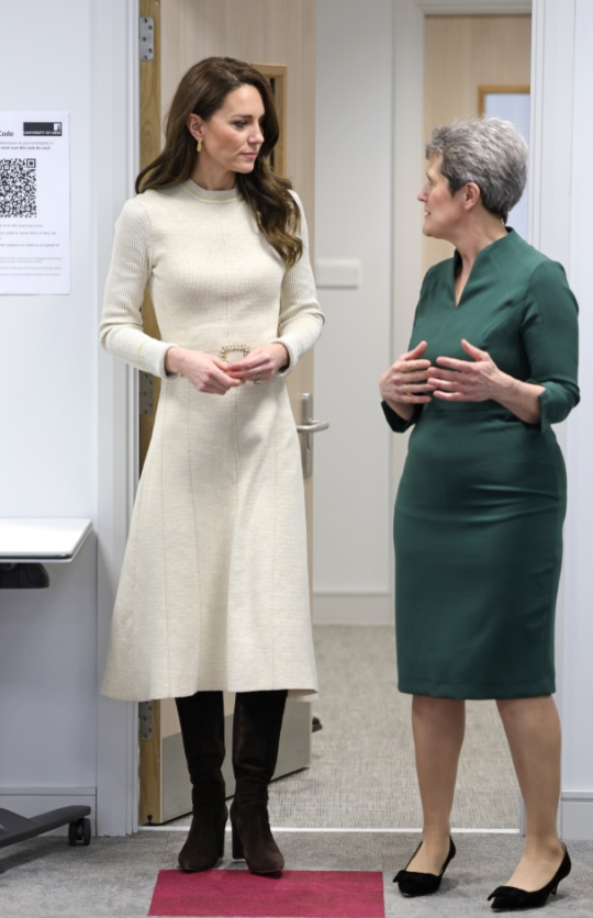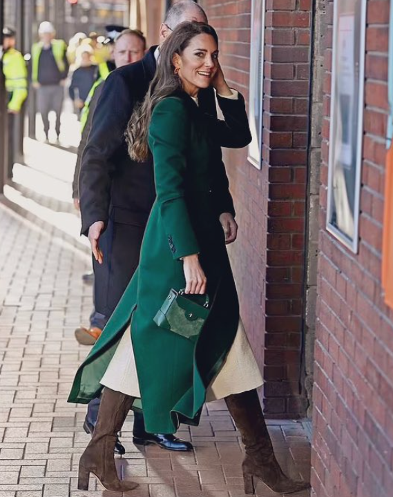 Kate entre en scène à Leeds le 31 janvier. Ce même jour, sa mère Carole Middleton prépare sa fête d’anniversaire. Sa venue attire toujours les foules. Un fan lui demande un selfie et lui confie être nerveux. “Nous le sommes tous. Prenez soi de vous”, lui répond-elle sous une nuée de flashs. Son manteau émeraude est dans la note. Encore une autre nuance dans le ton de sa campagne. Son pardessus abrite une robe crème à laquelle elle a ajouté sa signature: une ceinture écrue et or. Un nano sac apporte la touche finale. Au marché couvert, elle présente son œuvre, recueille la parole des commerçants et se rend au campus pour confronter ses idées à celles d’étudiantes spécialisées dans le développement des jeunes enfants. Tout n’est que sourires et politesse. Encore un travail mené de main de maître par la princesse majuscule qui trace son sillon sans l’ombre d’une fausse note.
