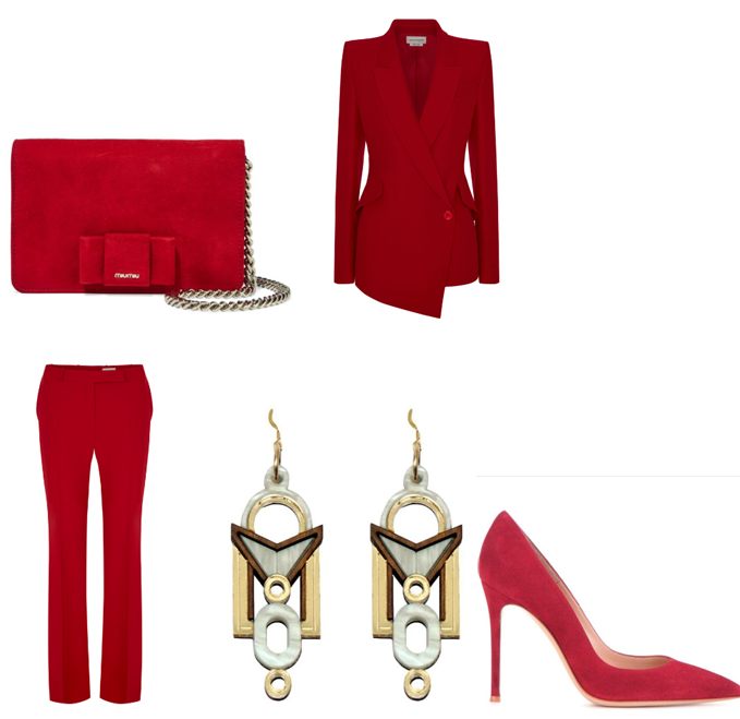 Sac Miu Miu, veste en crêpe Alexander McQueen, pantalon McQueen, Bo Chalk Florence in Regency, escarpins Gianvito Rossi