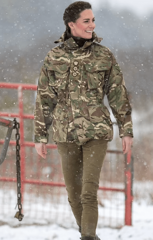 La princesse couvre son premier engagement en tant que colonel des Irish Guards. Elle se déplace à la base d’entrainement de Salisbury pour y rencontrer les soldats du 1er bataillon. La tenue de camouflage est de rigueur.