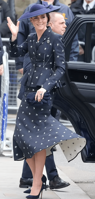 Sur le parvis de l’abbaye, l’archevêque accueille le chef de l’organisation gouvernementale et sa suite. Le vent joue des tours aux dames de la cour. Tous les Windsor se sont mis sur leur trente et un. Ils rivalisent d’élégance. Princesse Catherine a assorti sa tenue à ses bijoux précieux. Elle se distingue par sa prestance. Elle a investi dans un tailleur floral à basques et jupe à godets, de style rétro et un chapeau “soucoupe volante”, dans le même esprit que celui des funérailles de la reine. Elle et sa belle-mère n’ont pas prévu d’épingle à chapeau et sont obligées de tenir leurs couvre-chefs d’une main. Les boucles d’oreilles de Lady Diana scintillent aux oreilles de Kate.