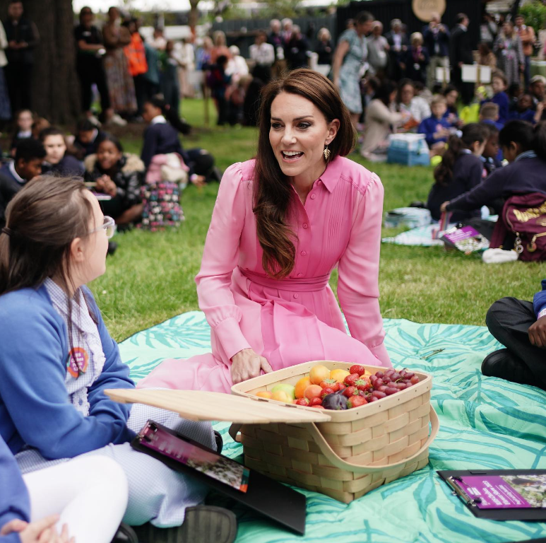 Le Chelsea Flower show débute aujourd’hui. La princesse de Galles pique-nique avec les scolaires. Sa robe rose et ses boucles d’oreilles fougères sont dans la note.