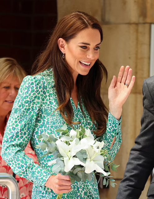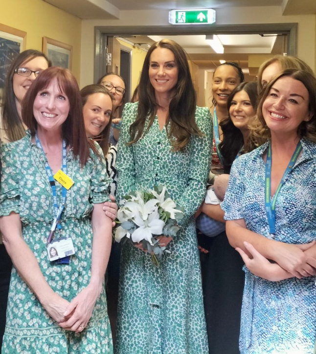 Je rejoins les avis des lectrices, je n’en peux plus de ses éternels escarpins dans toutes les couleurs de l’arc en ciel. À mon avis, elle devrait les réserver uniquement aux sorties protocolaires(Trooping the colours, Ordre de la Jarretière, Royal Ascot, Messes Commonwealth, Remenbrance Sunday, voyages officiels, etc). Pour rendre visite aux associations, une chaussure plate ou à petits talons, serait plus adapté. J’avais repris espoir, quand j’ai vu ses sorties en ballerines et puis pouf !! Dommage. Cependant, le sujet de sa visite, est important. C’est une cause noble. Elle porte une robe lumineuse, en soie ce qui est très agréable à porter au printemps/été. Mais je remarque qu’il n’y a plus beaucoup de repeat look depuis son nouveau statut royal. Pourquoi ne pas reporter une tenue de la tournée aux Caraïbes (je rêve de la revoir porter la saharienne rouge YSL Vintage avec le pantalon blanc). Avec ces escarpins et le sac blancs du jour, c’était parfait. La queue de cheval, lui allait aussi bien. Cela changeait des cheveux lâchés et des chignons.