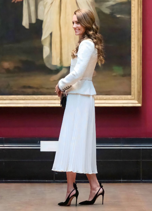 Chère Anne-Maure, je pense comme vous…Kate a piqué les escarpins de Meghan…C’est vrai qu’ils sont si beaux ! La tenue de Kate est très jolie, j’aime toujours le bel ensemble jupe plissée longue + veste courte. Mais cette dernière paraît effectivement trop chaude…Peut-être Kate craint-elle la climatisation du musée, si climatisation il y a…