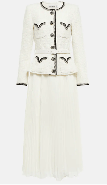 Alors moi , cet ensemble me laisse perplexe : rien ne va ensemble …ni la veste style Chanel , ni la jupe plissée et encore moins les chaussures ..on dirait qu’elle a pris au hasard pour s’habiller…or on sait que impossible !