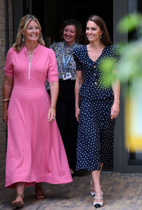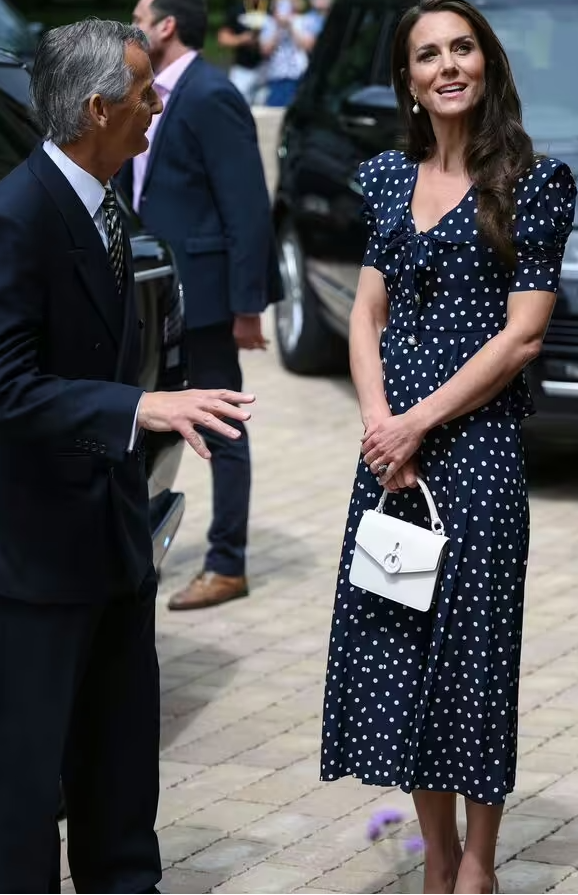 La porte de la voiture s’ouvre. C’est une robe peplum à pois, déjà portée à Wimbledon, un mini sac blanc et des escarpins bicolores. Avant de prendre congé, son altesse royale accroche son message à l’une des branches de l’arbre de l’espoir.
