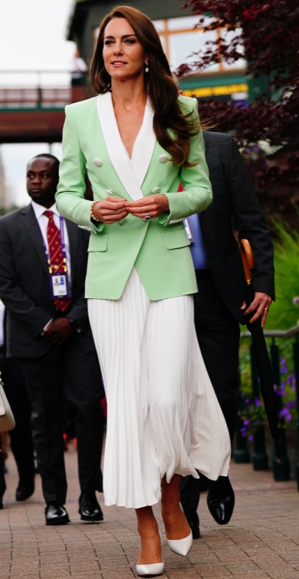 Blazer vert céladon…. et jupe longue blanche, plissée ? Une pure merveille, qui me donne aussi à penser à Lady Diana. Peut-être que des chaussures blanches plus plates auraient été plus seillantes pour le Sport Tennis. Mais que dit le “Dress Code” de la Princesse de Galles, Katherine, compte tenu de son rang ? Avec une pareille tenue, qu’aurais-je porté naturellement… des Tennis, ou bien des Mocassins, sinon des Ballerines ?