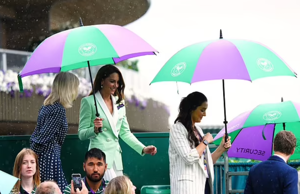 Jeu, set et match, c’est parti. L’édition 2023 de Wimbledon occupe l’affiche du 3 au 16 juillet. Lors de sa récente visite au centre de formation des ramasseurs de balles, la marraine tennistique au corps bodybuildé a montré de quoi elle était capable avec une raquette à la main. Elizabeth II n’a pas hésité à lui confier les rênes de Wimbledon en 2016. Fidèle au rendez-vous sportif le plus couru d’Angleterre, Kate n’a manqué l’évènement qu’à deux reprises : pendant sa grossesse et pendant la pandémie. En coulisse, la princesse délivre un message de remerciements et d’encouragement au staff. Ce mardi 4 juillet, deuxième jour du tournoi, elle assiste au match disputé sur le court 18 par la numéro 1 britannique Katie Boulter. L’ancienne championne Laura Robson lui tient compagnie. Un hommage est rendu à son ami Roger Federer. Les parapluies sont de rigueur. La météo est anglaise.
