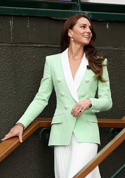 L’allure distinguée est recommandée aux spectateurs. La princesse porte un blazer hyper structuré, emblématique des collections Balmain par Olivier Rousteing. Nous la reverrons aux quarts de finales et aux finales (dames le 15 juillet) (messieurs le 16). Remettra-t-elle la robe jaune tennis, la grande capeline de paille, du blanc-la couleur officielle de Wimbledon-ou des petits pois ? Wait and see.