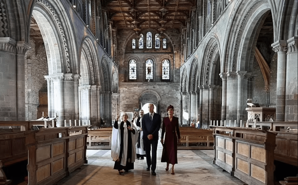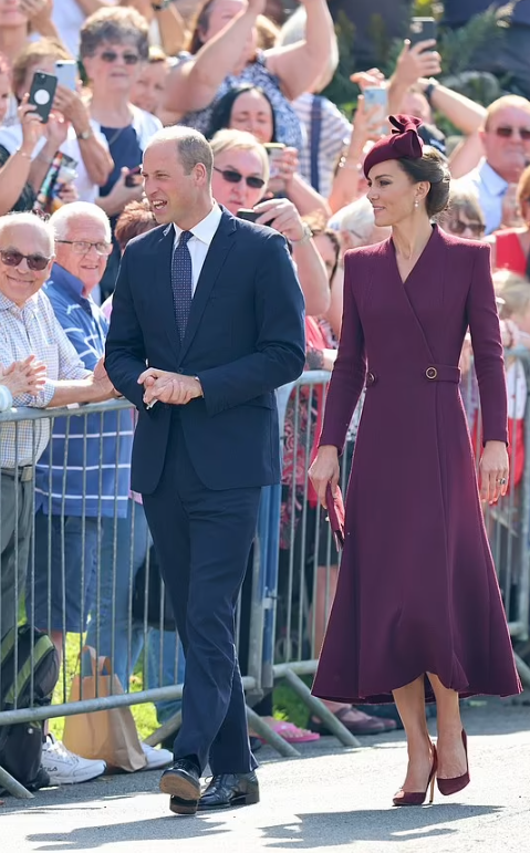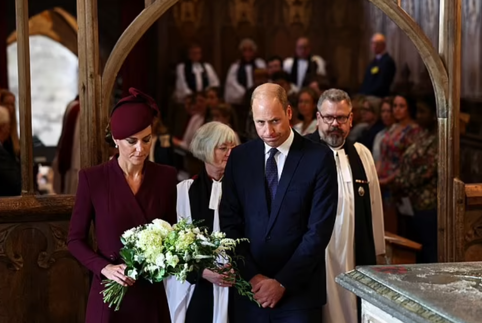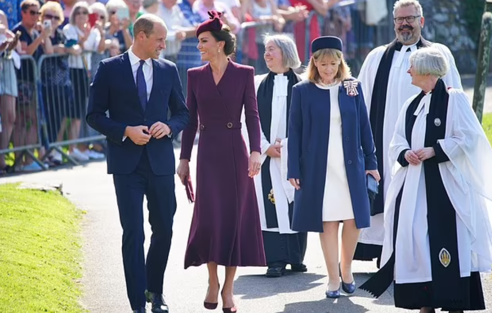 “Toujours dans nos cœurs”, titre le Daily Mail, dans sa tribune. Son souvenir est dans tous les esprits. Curieux calendrier qui place sur le même plan la commémoration et la Coupe du Monde de rugby. Le retour à la vie publique de la princesse de Galles coïncide avec une date émouvante : le premier anniversaire de la mort de la souveraine. Le couple héritier se déplace au Pays de Galles. Un office religieux se tient en la cathédrale St Patrick, où la grand-mère du prince William aimait se recueillir. La toilette bordeaux de la princesse Catherine se fond dans la solennité : une robe manteau tout en retenue (déjà portée) et un chapeau digne de ce nom. Les perles et diamants hérités de la souveraine brillent discrètement à ses oreilles.
