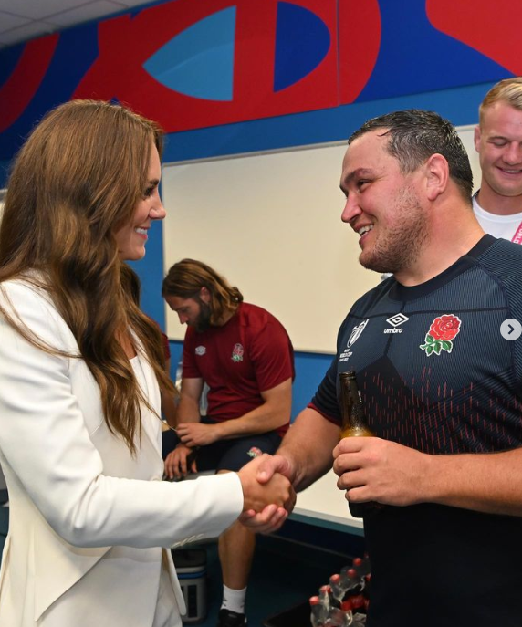 Ce samedi 9 septembre, l’Angleterre rencontre l’Argentine sous une température caniculaire. Un match qualifié de choc par les experts. La princesse de Galles, marraine du rugby britannique, suit l’événement depuis la tribune du Vélodrome. Sa présence et les mesures du God Save the King dopent le moral des dieux du stade. Marseille est sous le charme de Kate. Sa tenue formelle a déjà fait son effet : il s’agit du tailleur pantalon Alexander McQueen.