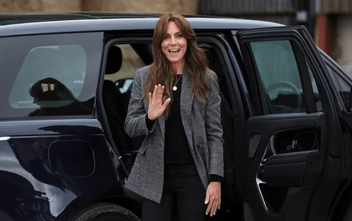 Toujours tirée à quatre épingles, Kate étrenne un blazer de la marque de prêt-à-porter française Maje, associé à un look noir : sous-pull orné de la médaille talisman et skinny. Un semblant de frange se dessine. Verra-t-on bientôt une nouvelle coiffure ?