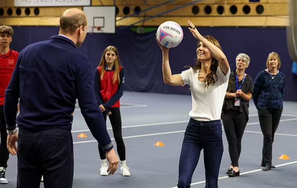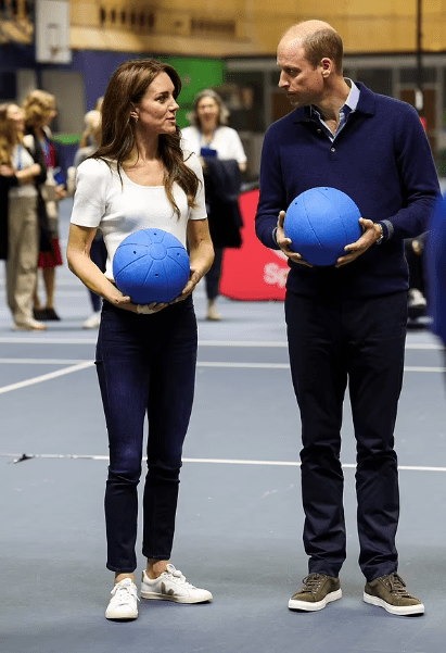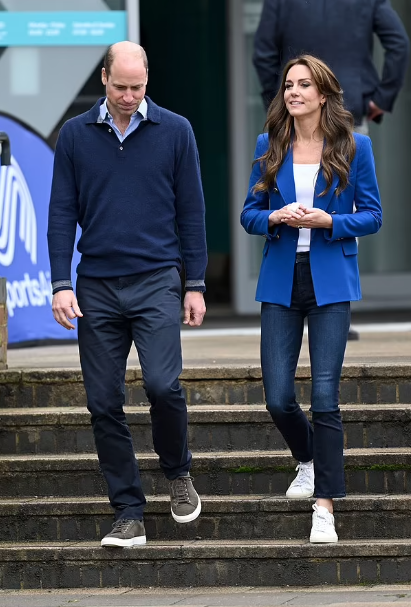 L’association SportsAid, que parraine la princesse de Galles, organise l’évènement du jour. La Range Rover se gare devant le centre sportif de Bisham Abbey. Blazer cobalt et jean pour la princesse bien dans ses baskets ( Kate opte pour une version veste pantalon plus relax que le traditionnel look tailleur ) ; pull polo marine et sneakers en croûte pour monsieur…un style moins formel qui va mettre à l’aise leurs interlocuteurs. Plusieurs ateliers de discussions sont au menu ainsi que des activités sportives.