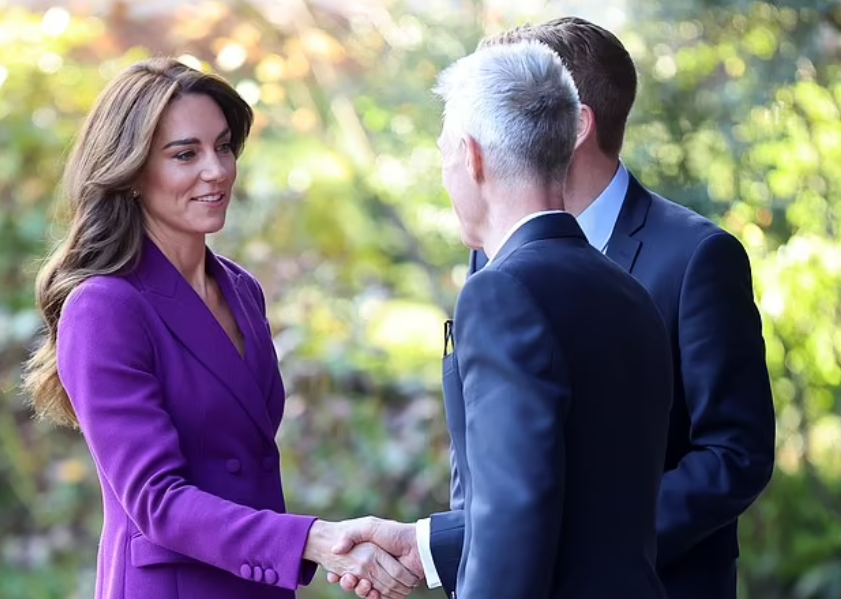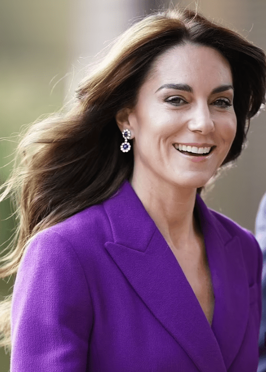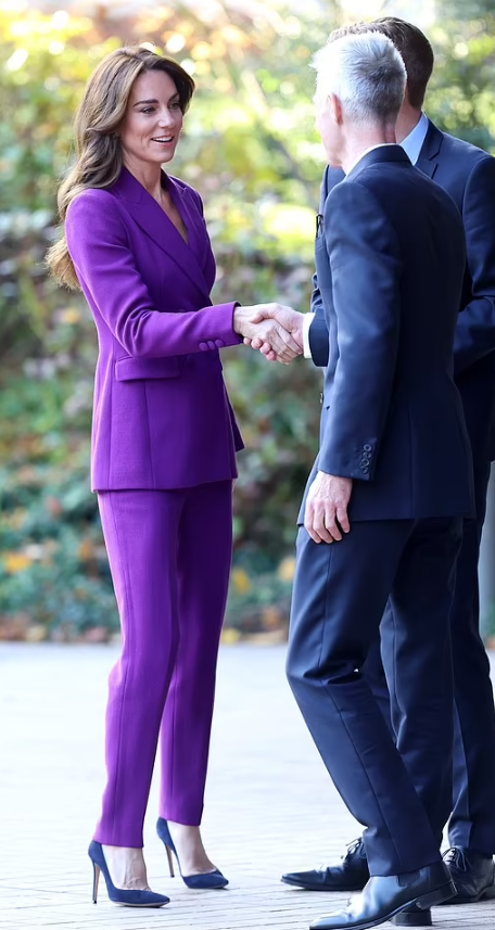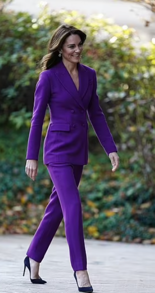 La nuit a été courte. La fête d’anniversaire de King Charles s’est prolongée tard dans la nuit. Le couple princier a quitté Clarence House aux environs de minuit. Le lendemain, Catherine de Galles qui couvre une mission importante, n’affiche aucun signe de fatigue. Elle est aussi fraiche qu’une rose anglaise. Plusieurs clichés se télescopent. L’icône a été photographiée dans deux looks pantalons déjà arborés, créés par son couturier français attitré. D’abord, hier soir, en bordeaux à la réception Shaping Us qui se tenait avant la Royal Birthday Party. Puis, ce mercredi en costume violet électrique, à la ligne plus près du corps. Les photos en costume nuance “burgundy” n’ont été mises en ligne qu’aujourd’hui, pour ne pas faire d’ombre au roi Charles. Une vidéo la montre de dos, dans le long couloir qui la mène au podium, où elle va répéter son discours. Et elle assure, revêtue de son ensemble de femme d’affaires !