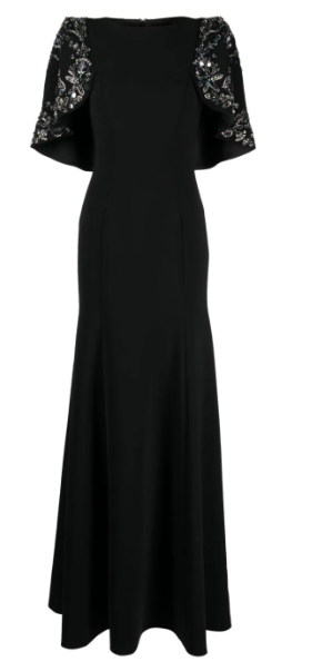 Très jolie tiare, c’est bien dommage qu’elle ne ressorte de son écrin que maintenant ! J’aime également beaucoup la robe avec cette petite cape ornée de broderies dorées. En revanche, le combo cape + gants ne fonctionne pas selon mon humble avis, les gants me paraissent de trop…