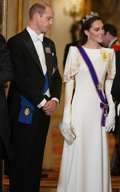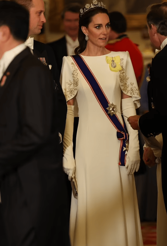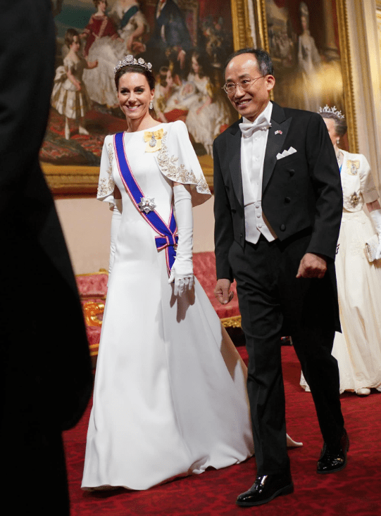 Quelle jolie femme élégante ! J’aime beaucoup la splendide robe à manches pagodes de la Princesse Katherine, qui me semble ainsi célébrer ses invités Coréens… mais peut-être que je me l’imagine seulement ! En tout cas, cette douce association de longs gants blancs avec des manches pagodes brodées d’or vont bien avec sa fine tiare fleurie, de femme jeune et dynamique …. C’est magnifique, pur, et féerique ! Comme dans un conte…. une vraie Princesse !