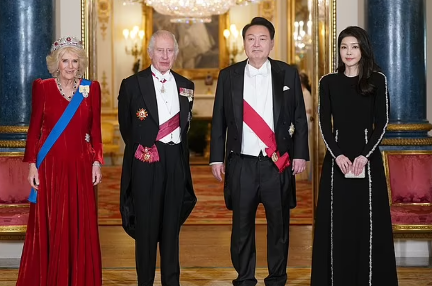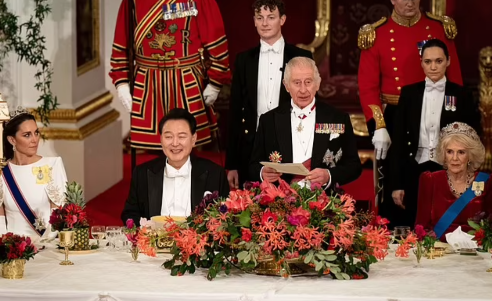 Sur le menu approuvé par les souverains, on a reporté en français la liste des mets servis dans de la porcelaine fine, frappée aux chiffres du souverain : tartelette d’œuf poché et purée d’épinards, faisan Windsor sauce calvados, bombe glacée à la mangue. Le discours du roi scelle l’entente entre les deux nations. Charles prononce quelques mots en coréen, très applaudis par l’auditoire. Les deux chefs d’Etats portent un toast à l’amitié avant de goûter aux plats.