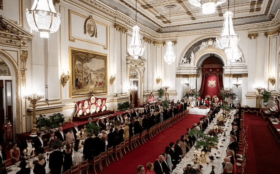 Encore une nuit magique au palais. Apogée de chaque visite d’Etat, le Banquet donné par les souverains au palais de Buckingham. Les toilettes des dames de la Cour déclinent la note féerique. Une apparition éblouissante enchante la Toile : celle de la grande Catherine coiffée d’une tiare fleurie.