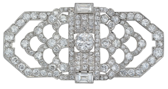 Catherine The Great dans tout son éclat. La broche Art Déco en diamants retient le ruban bleu du Royal Family Order