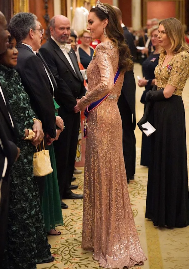 La soirée du 5 décembre se termine en apothéose. Encore une opportunité de ressortir les diamants de la couronne. La famille royale renoue avec les fastes. Plus de 500 délégations britanniques et étrangères sont conviées à la réception annuelle du corps diplomatique. Les festivités se déroulent dans le salon d’apparat du palais de Buckingham. C’est la première fois que le quatuor parait ensemble depuis la parution de Fin de règne. Le roi et sa suite lancent la contre-offensive de charme et de diamants.