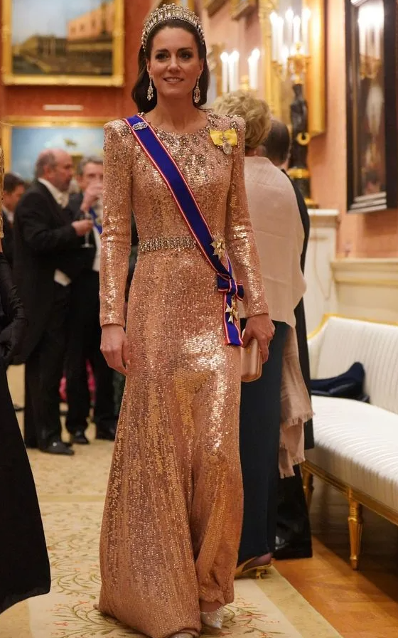1. Bonjour, ce n est pas la même décoration, l ordre de la Jarretiere pour le roi la reine et William, et un autre ordre (je n ai pas retenu lequel) pour Kate. Ceci peut expliquer cela. Mais certainement Linda doit avoir des informations plus précises.