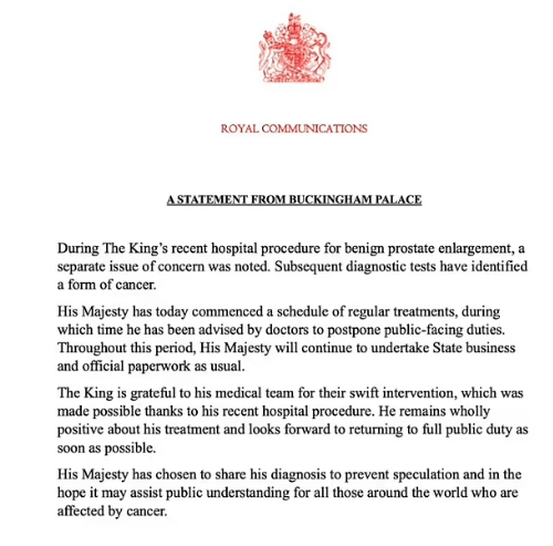 Nous souhaitons un prompt rétablissement à Sa Majesté ” tweete le Premier ministre Rishi Sunak. Ce message, et ceux, nombreux, envoyés par les puissants de ce monde, font écho au dernier communiqué de presse de Buckingham : “Le roi Charles III est atteint d’une forme de cancer, diagnostiquée il y a une dizaine de jours, au cours de son opération de la prostate. Et de poursuivre que “le souverain reste très optimiste quant à son traitement et espère reprendre ses fonctions publiques dès que possible. ” Le palais spécifie qu’il ne s’agit pas d’un cancer de la prostate mais ne précise pas de quel type de cancer souffre le monarque. Charles III reste toujours en charge des affaires de l’Etat. Il continue d’assurer des tâches administratives. Les audiences avec le chef du gouvernement sont maintenues. Les médecins lui ont conseillé de reporter ses activités de représentation. Le père des princes William et Harry a téléphoné à ses fils pour les mettre au courant. Le cadet, expatrié en Californie, va faire le voyage, seul, dans les prochains jours. God save the King.