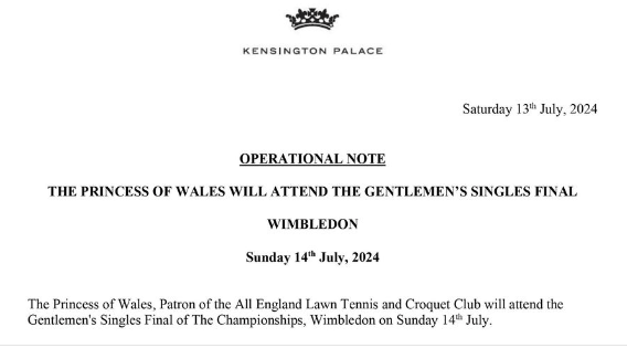 Alerte info ! Le palais de Kensington annonce que la finale messieurs se déroulera en présence de la princesse, dimanche 14 juillet. Belle surprise faite à ses fans.