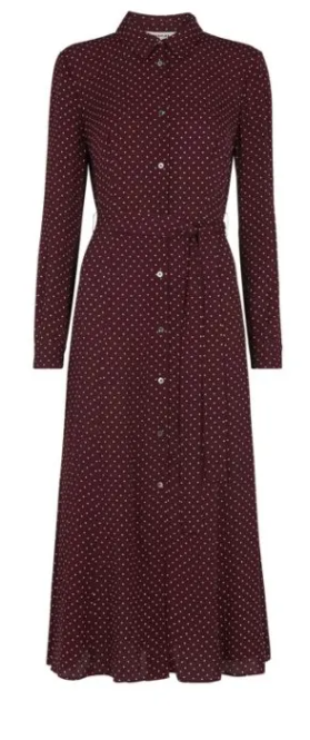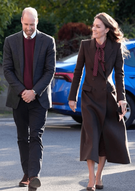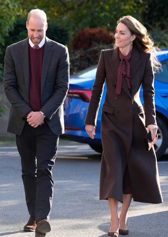 Côté tenue, j’aime beaucoup son long manteau mais moins l’association avec la robe bordeaux à pois. L’ensemble me parait terne, même si leur déplacement à Southport n’appellait pas de couleurs pimpantes.
