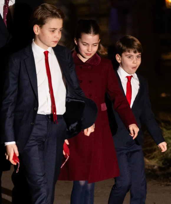 La princesse Charlotte entourée de ses deux frères. Manteau bordeaux raccord avec celui de maman et costume cravate comme daddy