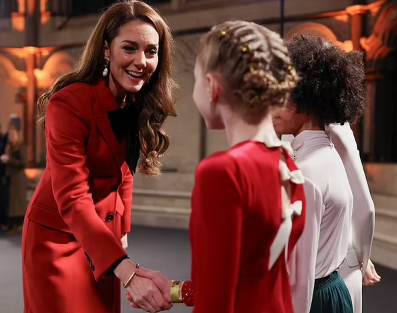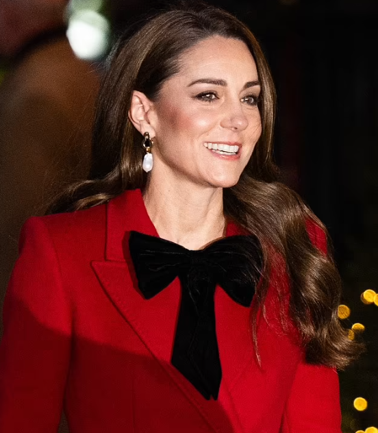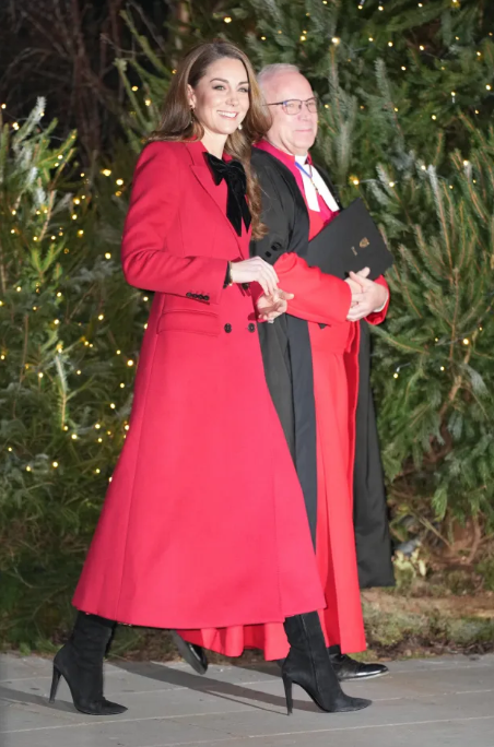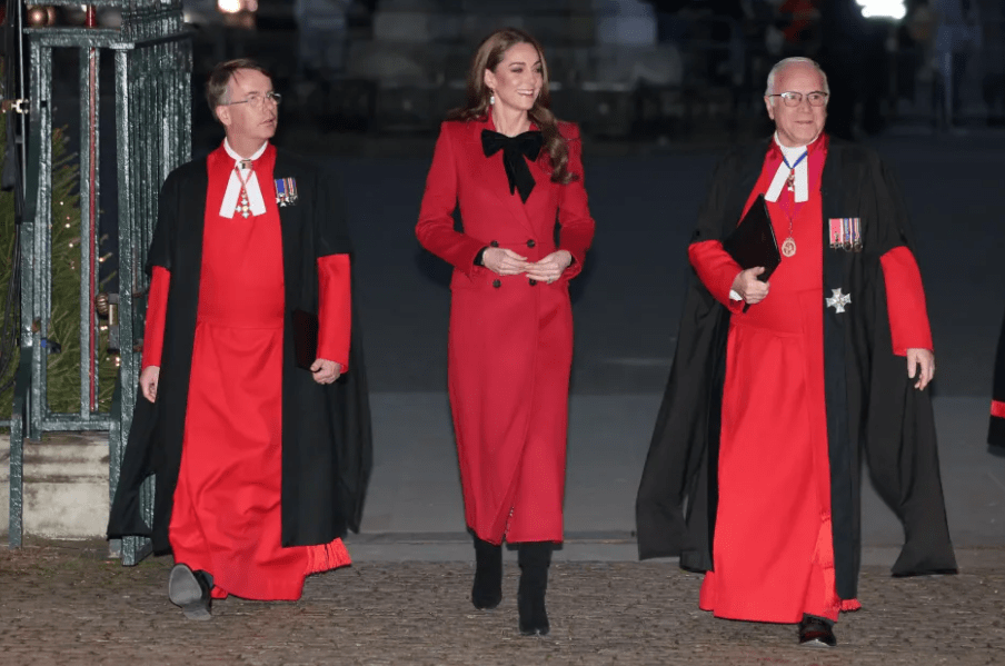 La princesse de Galles en rouge et noir. Son manteau Alexander McQueen est raccord avec les habits liturgiques