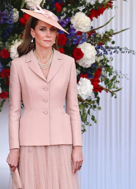 Tout d’abord je suis ravie que la Princesse de Galles soit présente pour cette visite d’État. Pour la tenue Dior, la couleur blush lui illumine le teint et l’étoffe légèrement mais Christian Dior a créé la veste Bar avec la jupe pour sublimer les formes des femmes.