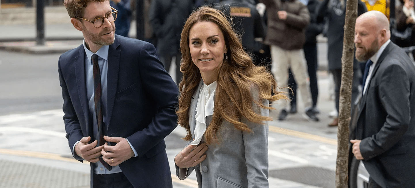 Quel plaisir de voir Kate en pleine forme et très impliquée. Joli tailleur pantalon gris clair. Petit bémol pour moi sur la coiffure qui fait un peu “rideau”. Mais c’est son choix, sans doute se sent elle plus sure d’elle avec des cheveux aussi longs.