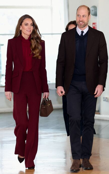Les amoureux retournent aux affaires. Fidèle à son uniforme de travail, HRH reporte un ensemble taillé pour le job. Le bordeaux a la côte royale.